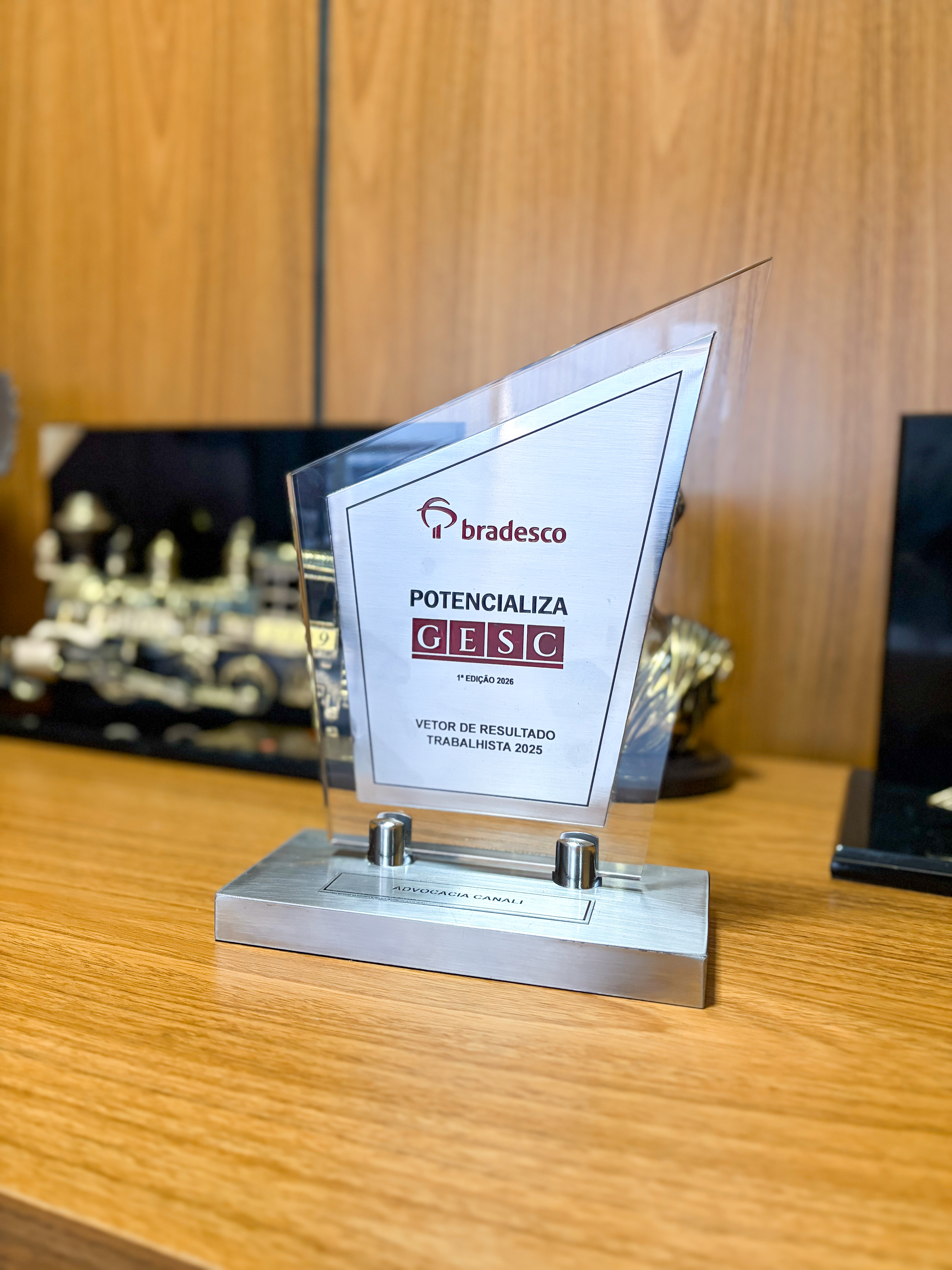 No dia 25/01/2026, a Advocacia Canali foi homenageada pelo Bradesco com o prêmio Potencializa GESC – Melhor Vetor de Resultado Trabalhista 2025, reconhecimento que consagra o escritório como aquele que obteve o melhor desempenho no ano de 2025 entre todos os que atuam em nome da instituição na área trabalhista.